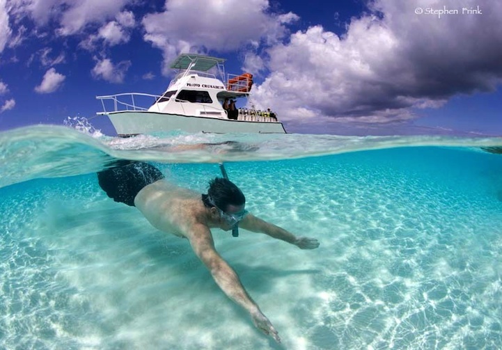 Second Rule: Both the over and underwater parts need to be interesting Both the underwater and topside halves of the image need to be interesting or you have a boring non-picture. The reason we see so few really good over-under images is because there are not loads of opportunities for incredible topside with magic happening below the waterline. I think this is why we see so many pictures of divers swimming in blue water under a live aboard dive boat at high noon. Take your time and look at your surroundings. If I think something might work I try it. Failures are ok; always better to reach for something.